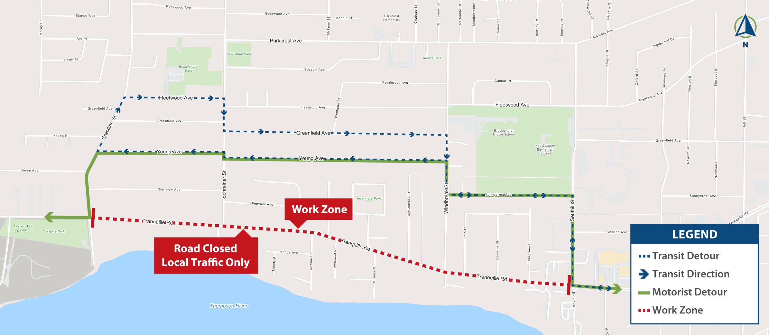 The transit detour route will follow Young Avenue via Southill/Sunnycrest when travelling westbound, and Greenfield Avenue via Sunnycrest/Southill when travelling eastbound. To plan your route, visit BCTransit.com/Kamloops.