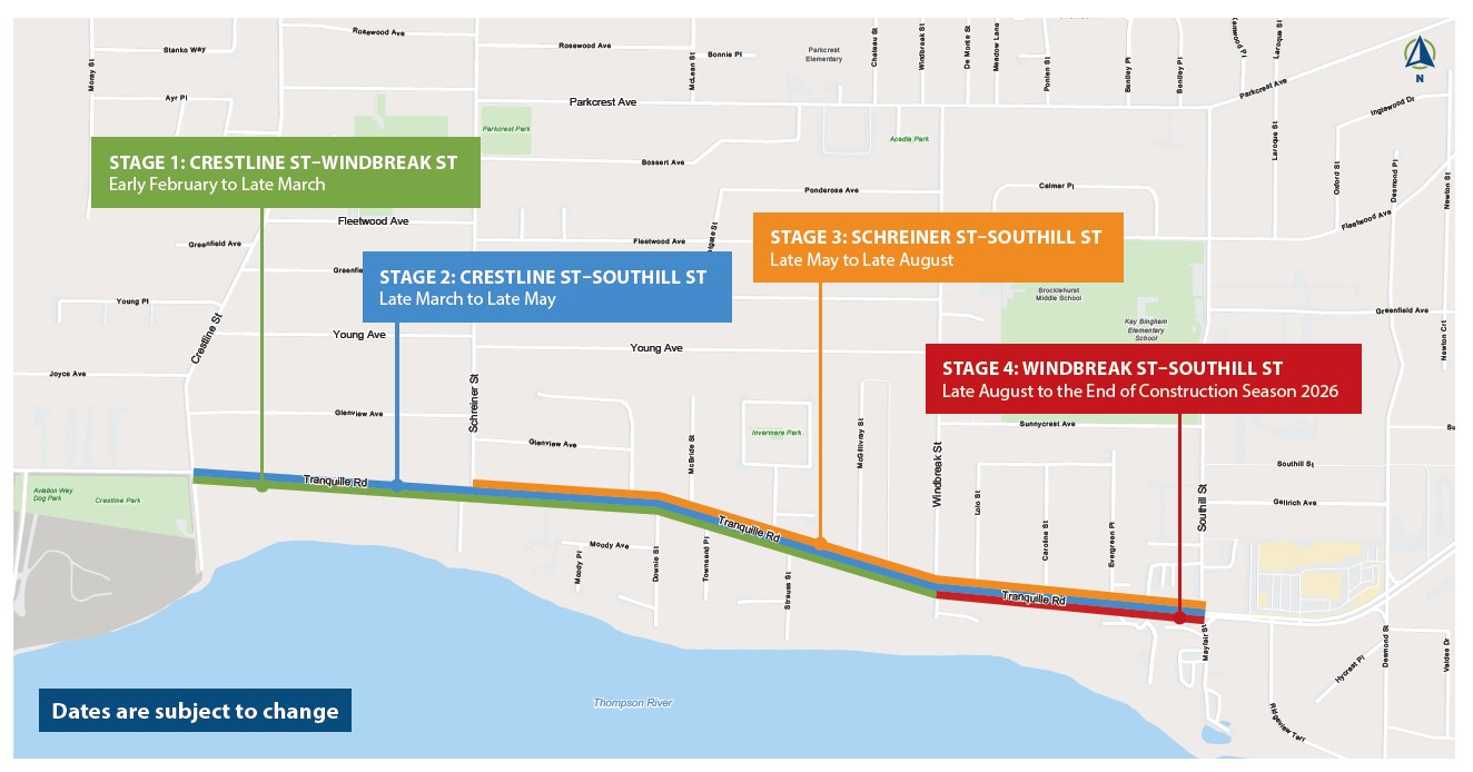 The City of Kamloops is advising properties of the recommencement of Tranquille Phase 3 work beginning on February 2, 2026 (weather dependent). Crews will return to the area of Downie Street to begin removal of asphalt, pre-locates, gravel stripping, and other works.